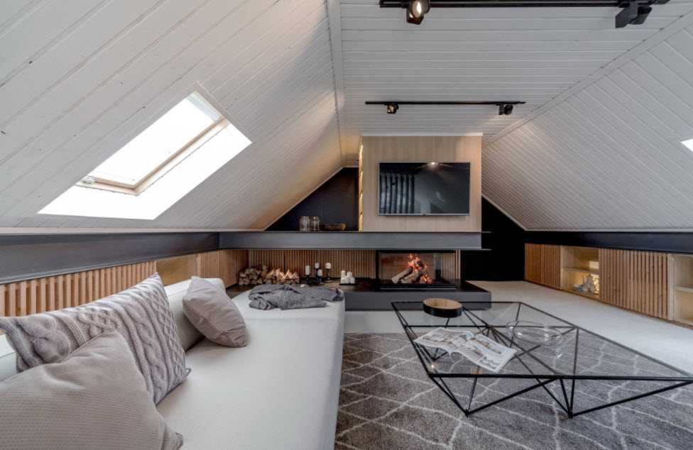 При наличии достаточного пространства мансардный этаж можно превратить в уютную гостиную или каминную залу, где будут собираться все члены семьи и располагаться гости.