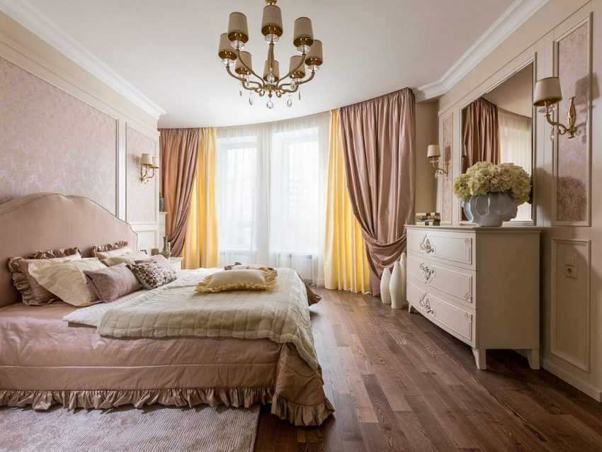 Классика – это всегда пышных размах и монументальность, поэтому именно в такой спальне уместны многослойные декоративные композиции