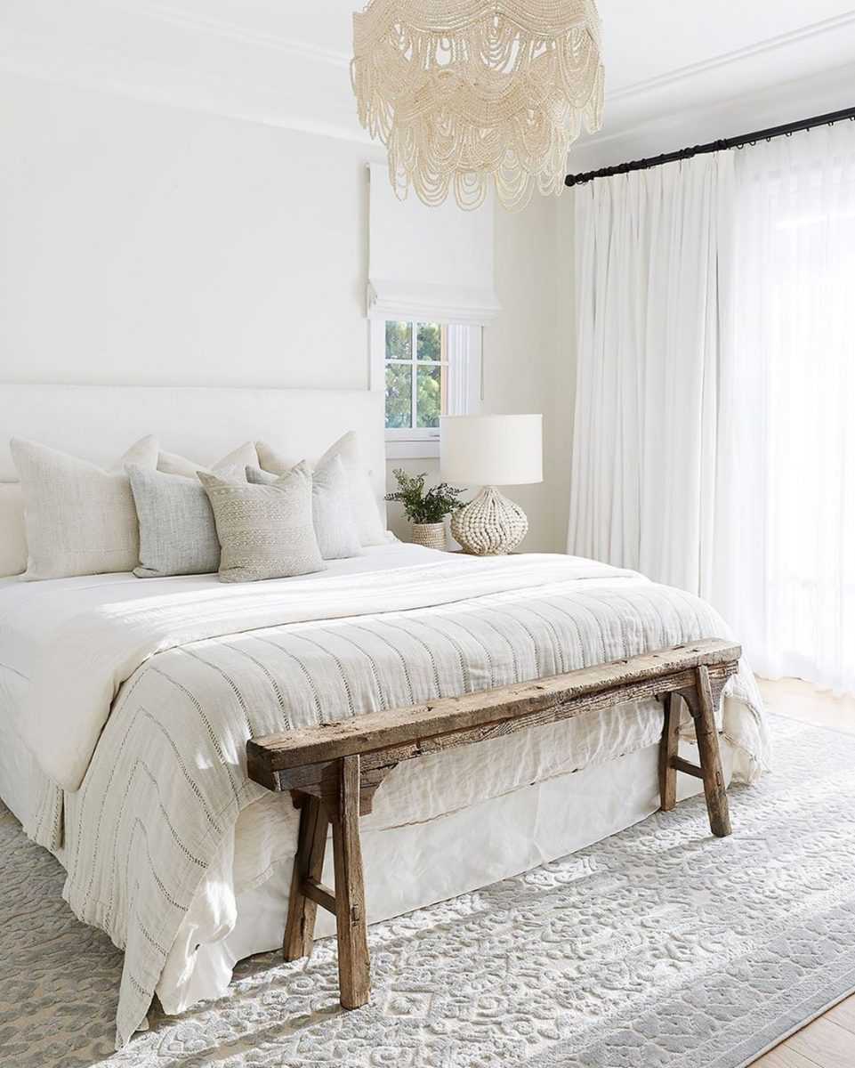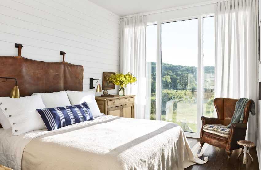Он полностью строится на натуральных материалах и тканях – и в спальне это особенно важно для здоровой атмосферы. Здесь уместны даже грубые фактуры, вроде жесткого льна или мешковины вместо шелка и тонкого хлопка