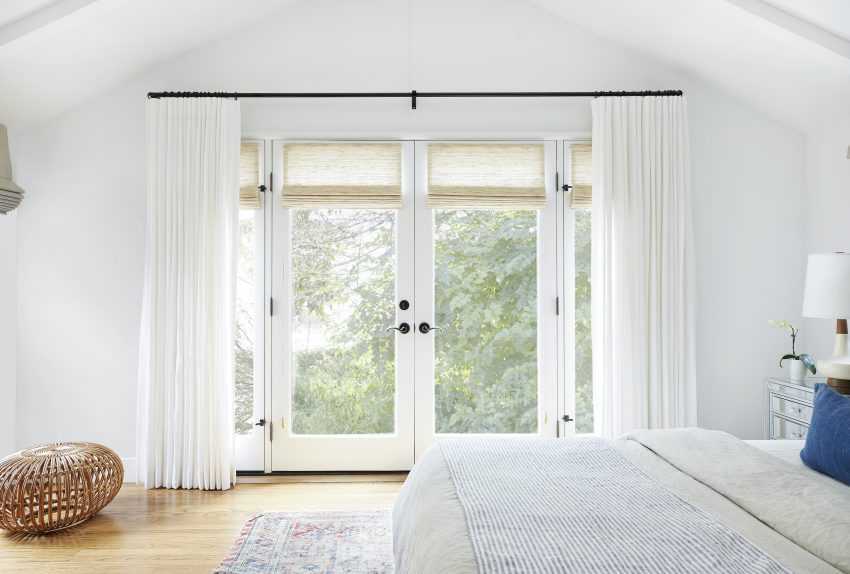 При наличии балконной двери следует сохранить возможность беспрепятственного доступа на балкон. Для этого можно использовать модель с подъемным механизмом. Для варианта раздвижных штор одну сторону закрепляют подхватами к специальным креплениям на поверхности стены.