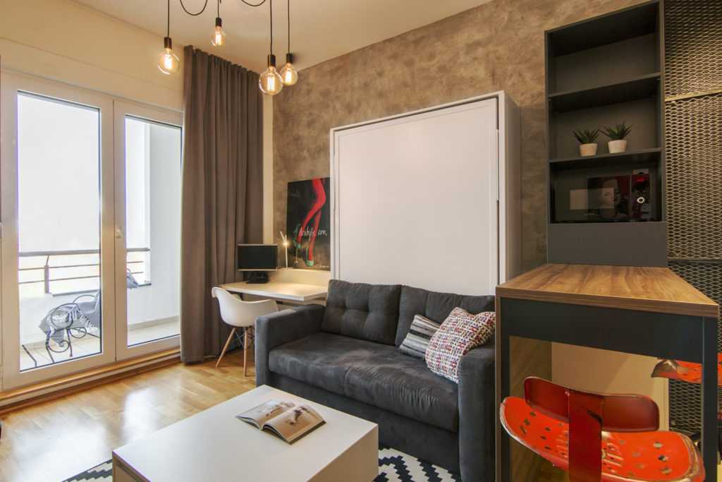 Вся мебель закономерно должна иметь механизмы трансформации. В некоторых случаях выручают откидывающиеся в нишу изделия. При обустройстве полноценной гостиной кроме дивана ставят кресла и пуфы. В кухне предпочтение отдается подвесной мебели. Если же что-то и ставится на пол, то только у стены, чтобы экономить пространство. Полезно «освоить» подоконник в качестве продолжения стола, но не всегда это возможно.