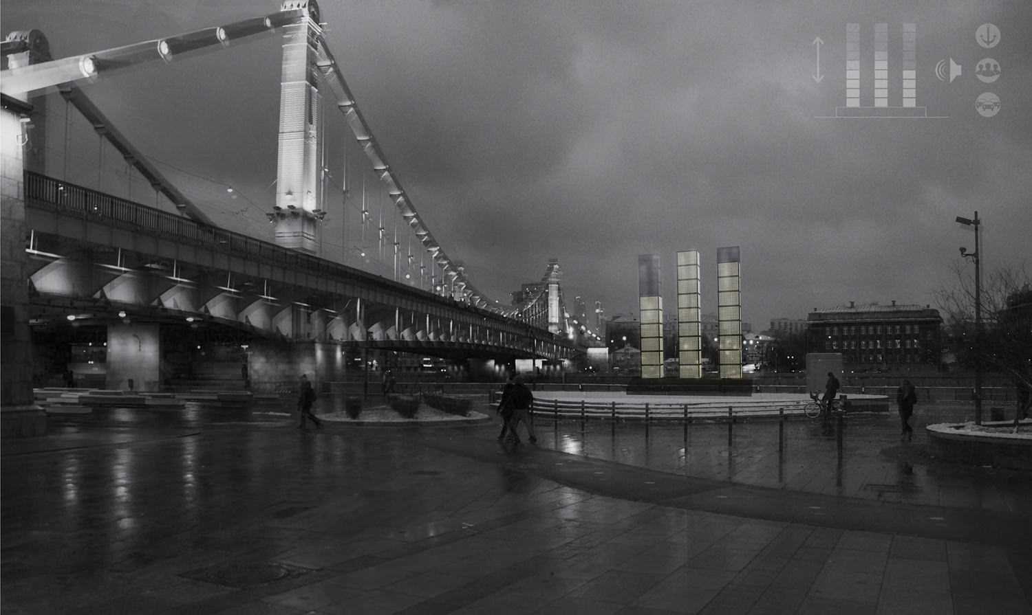 Кинетическая скульптура «Звуки города» поддерживает главную архитектурную тему Крымской набережной. Здесь соединяются потоки воздуха, воды, транспорта и пешеходов. Реагируя на городской шум, арт-объект визуализирует его как эквалайзер. В «спокойном» состоянии скульптура работает как светильник.