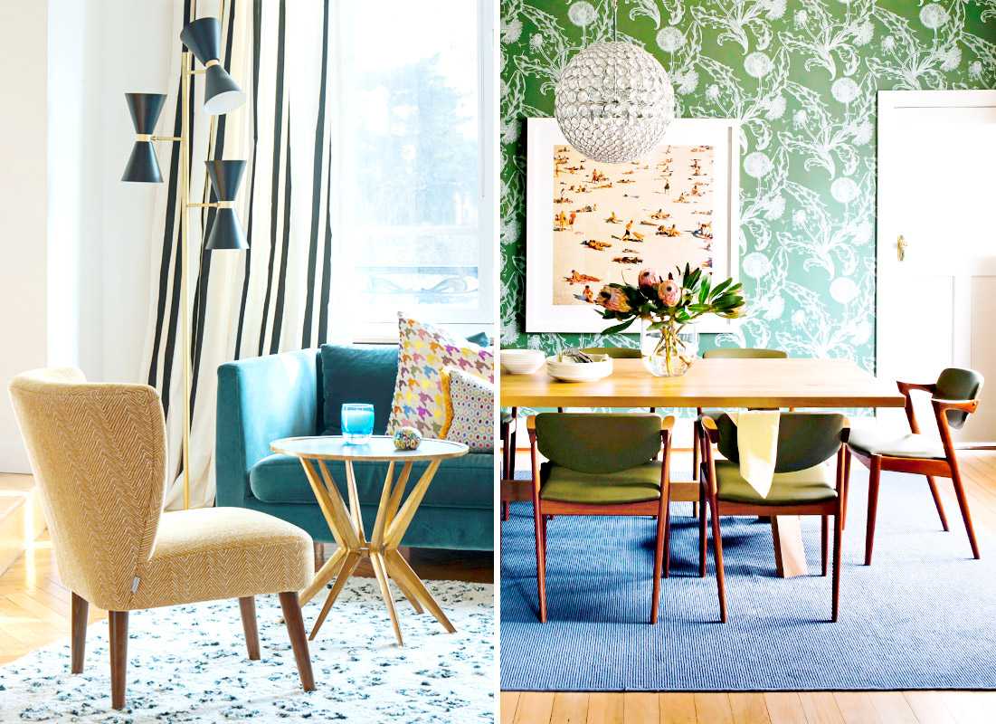 Предлагаем вам рассмотреть два варианта интерьеров в стиле мид-сенчури: в ярких и классических пастельных тонах.
