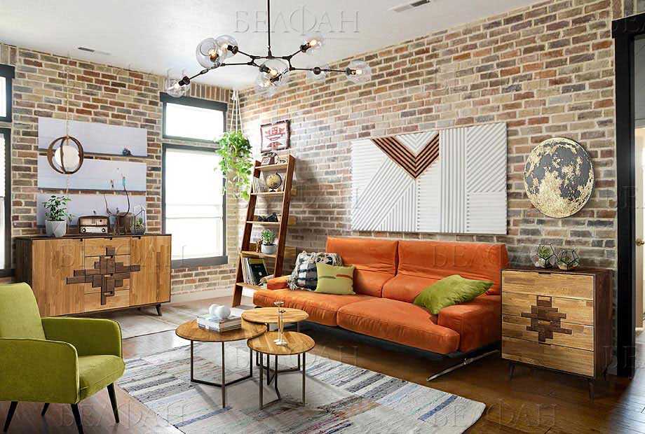 Отдать предпочтение стоит мебели из дерева. Что касается цвета, то акцент должен быть на одном предмете мебели. Если в помещении уже есть несколько стульев ярких цветов, то диван должен быть выполнен в нейтральных оттенках. Если же диван в ярком цвете, то другая мебель должна быть в пастельных тонах. Также стоит помнить, что в данном стилевом решении мебель с принтами не приветствуется. Для этого стиля характерна простота во всех её проявлениях.