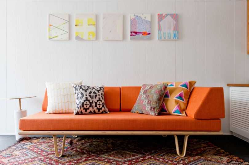 Одной из типичных особенностей стиля Mid Century Modern в интерьере является использование ярких и смелых оттенков – красного, жёлтого, синего или зелёного, объединённых со строгими чёрным или белым цветами. Также часто шли в ход терракотовый, оранжевый, горчичный, коричневый и болотно-зелёный цвета.