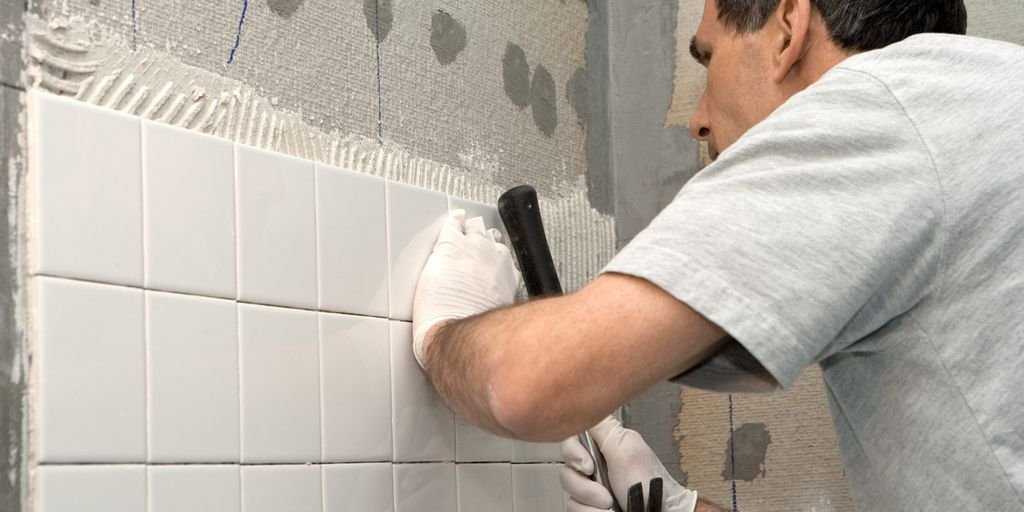 После высыхания грунтовки разводится специальный плиточный клей, и материал начинают укладывать от дальнего от двери угла помещения, периодически проверяя строительным уровнем, насколько ровной получается стена. Для монтажа настенной плитки рекомендуется выбирать клей с минимальным сроком высыхания — иначе есть риск, что плитка «сползет» по стене и нарушит симметрию укладки.