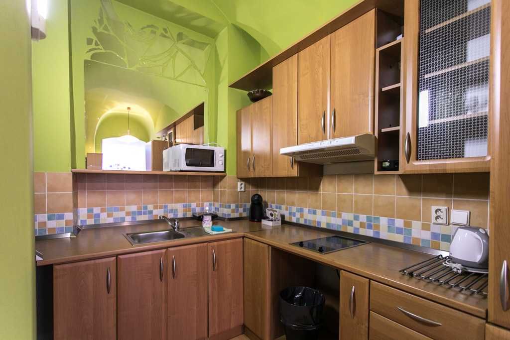Такая меблировка хорошо впишется в кантри-дизайн и классический. Можно выбрать фисташковый гарнитур из ламинированного ДСП, древесины или акрилового камня. Данный колер любое помещение наполнит уютом.