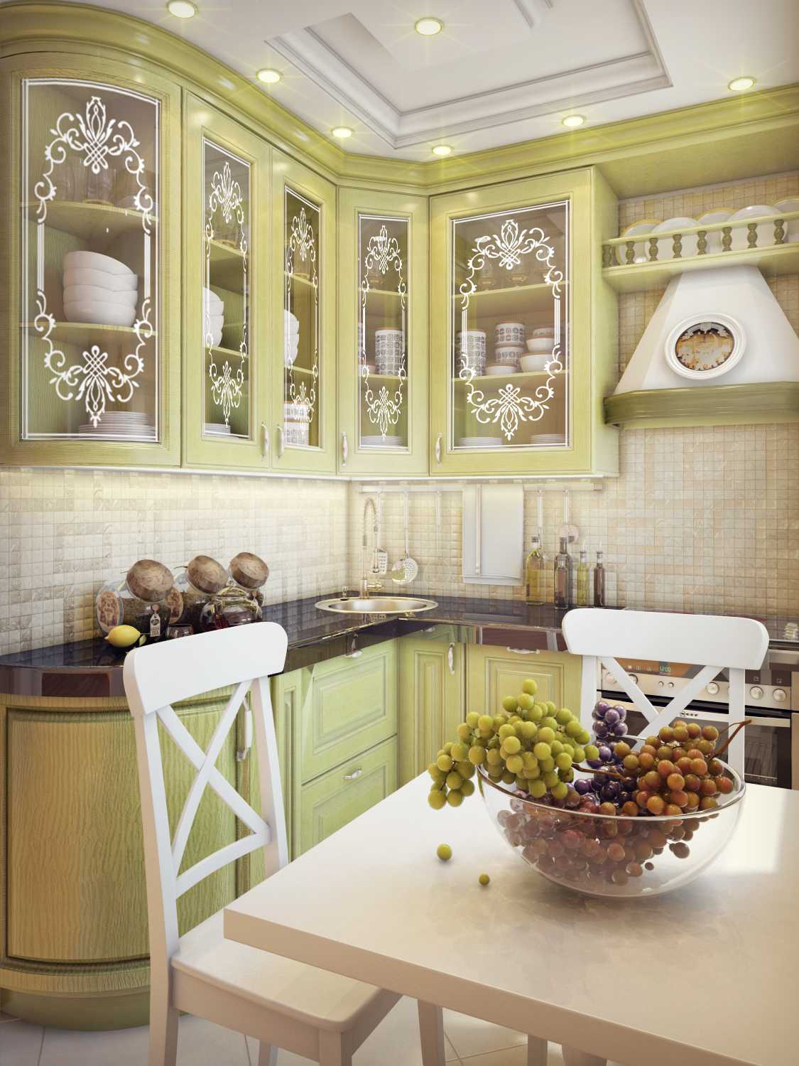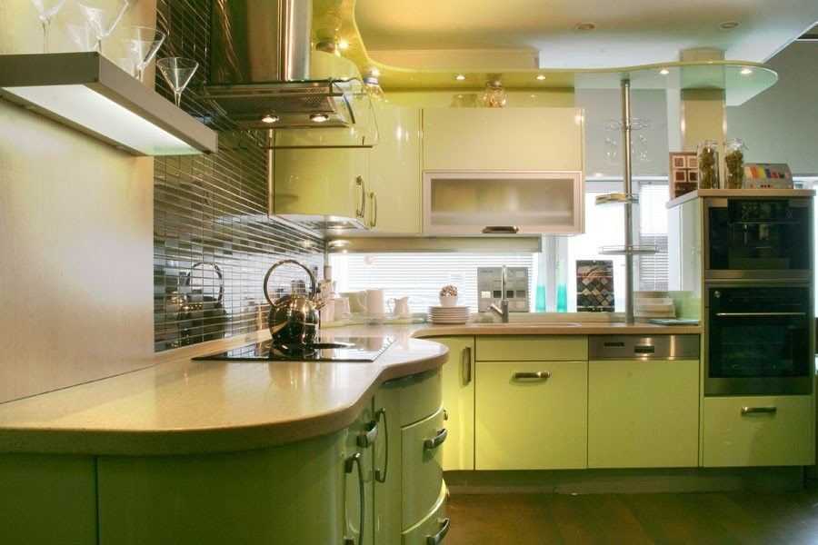 Если потолок на кухне двухуровневый, элементы фисташкового цвета стоит добавить и в его оформление.