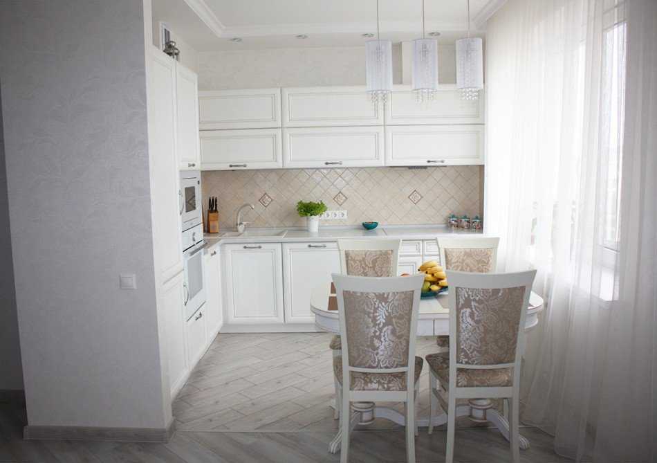 В чем преимущество такого разделения? Оно позволяет не опасаться попадания воды и жира на пол в зоне «куховарства», при этом сохранить ощущение комфорта и теплоты в столовой. Именно такой вариант, как правило, увенчивает поиски самых расчетливых хозяев.
