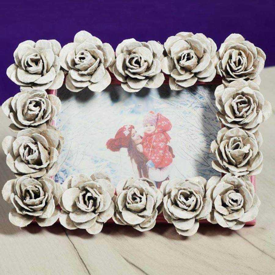 Из коробки для яиц изготавливаются цветы. Для этого вырежьте ячейки так, чтобы получились лепестки. Из других ячеек вырежьте лепестки меньшего размера, скрепите между собой элементы при помощи клея так, чтобы получилась роза. Готово. Теперь цветочки можно приклеить на простую или объемную рамку.