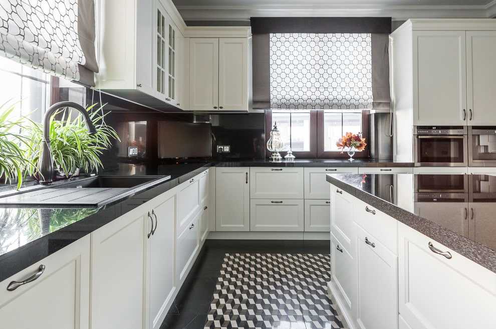 Традиционная классика предполагает наличие качественной мебели из натурального дерева, строгих линий и спокойных оттенков. В соответствии с этим, римские шторы для кухни в классическом стиле лучше подбирать из льна или хлопка в бежевой гамме, однотонные или украшенные спокойным, неброским орнаментом.