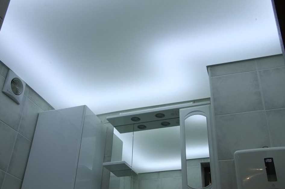 Цель применения такого материала – помещение внутрь специальной подсветки. Для такого потолка применяется особенно тонкая плёнка. Подсветка может быть любого цвета — зелёной, голубой, розовой, жёлтой. Все цвета будут смотреться гармонично, сочетаться с плёнкой белого цвета. Такой вариант наиболее приемлем для молодёжных комнат или помещений в развлекательных заведениях. Уместен полупрозрачный белый потолок с цветной подсветкой в бутиках.