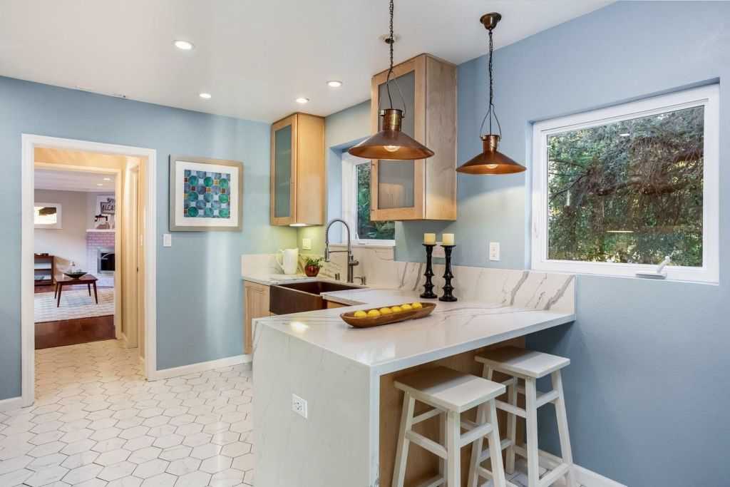 Интерьер кухни с двумя окнами, расположенными на небольшом расстоянии друг от друга, украшается тканями, украшениями или растительными мотивами. Поместите мягкие углы или напольные шкафы в углы под подоконниками или вплотную к ним. Телевизоры, цветочные горшки, микроволновые печи и т. д. разместите на угловых столах.
