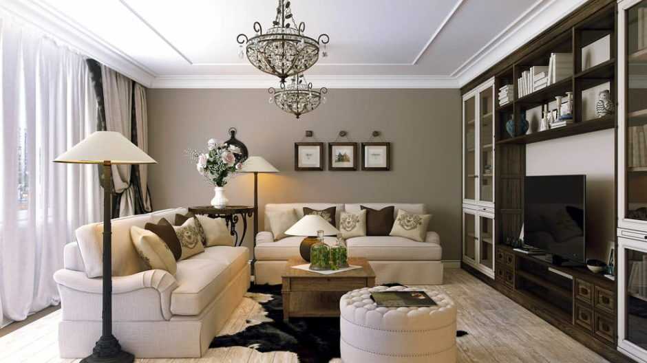 Но все же в гостиной в стиле американской классики придется придерживаться традиционных веяний. Ее фон следует сделать светлым. Так вам легче будет добавлять в обстановку контрастные и красочные аксессуары, предметы обстановки, а также зонировать пространство. Даже дизайнеры с немалым опытом работы не рискуют смешивать в классической гостиной более двух цветов.