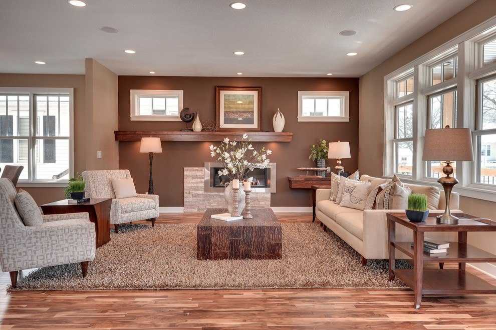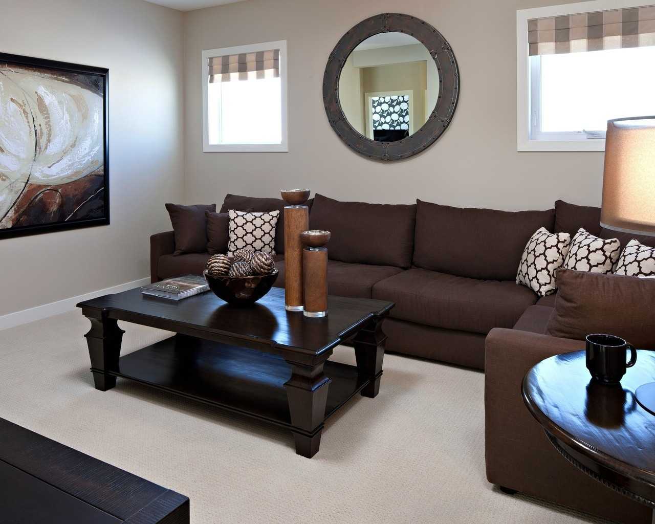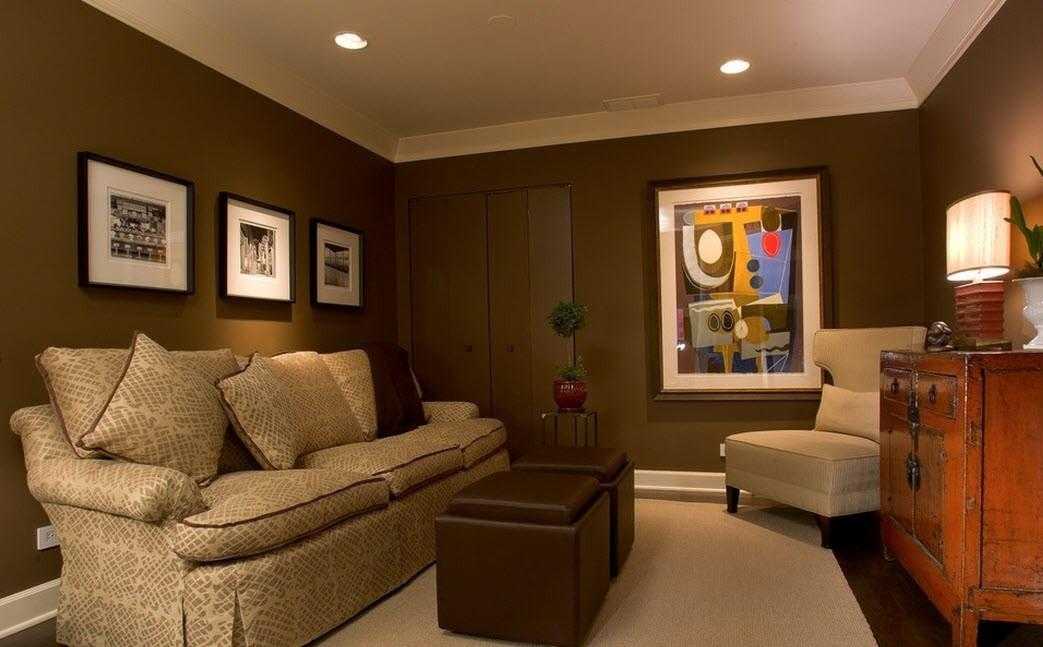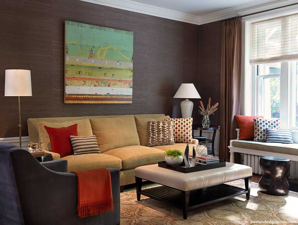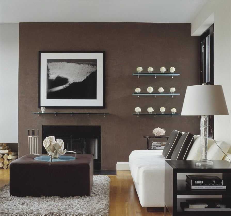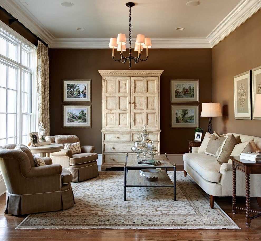 Если коричневому цвету отведена второстепенная роль в колористической схеме интерьера, то разумно его максимально использовать для декора зала: