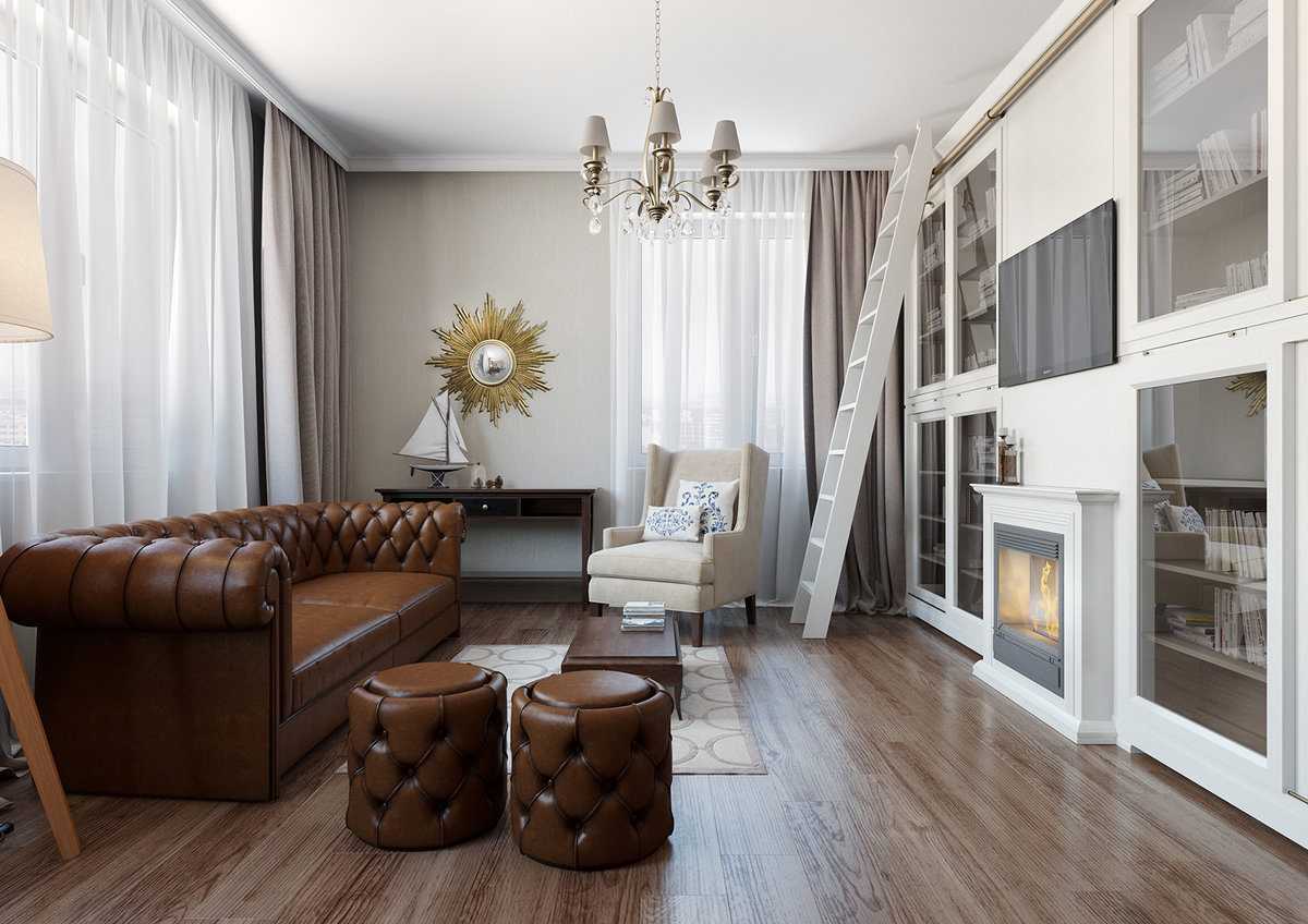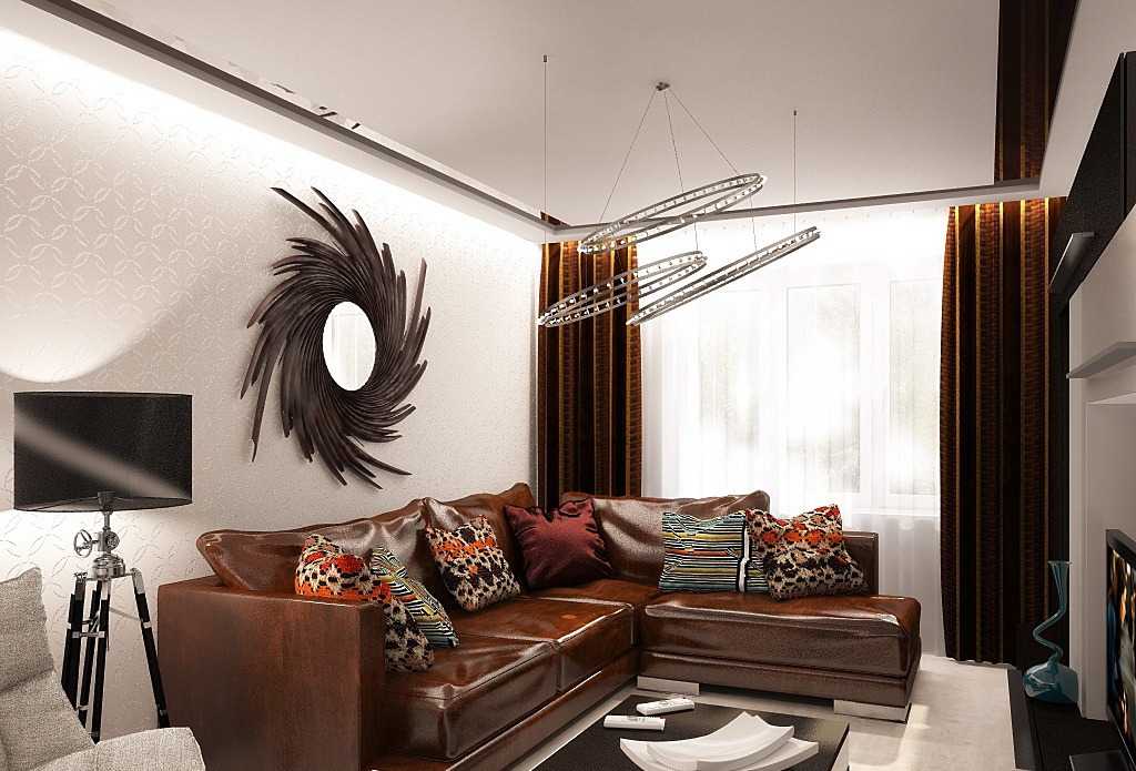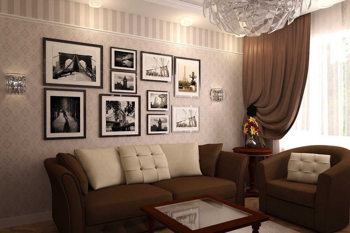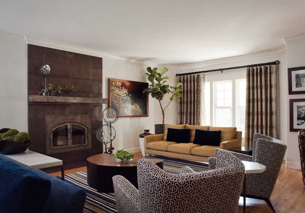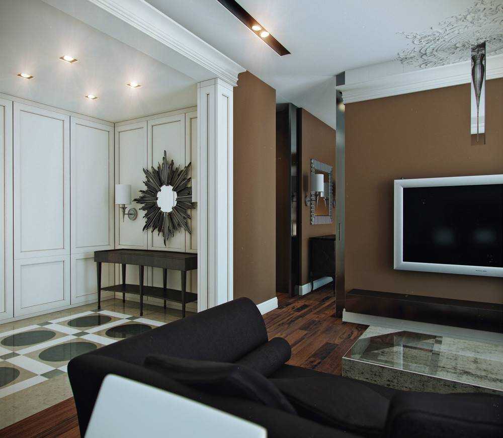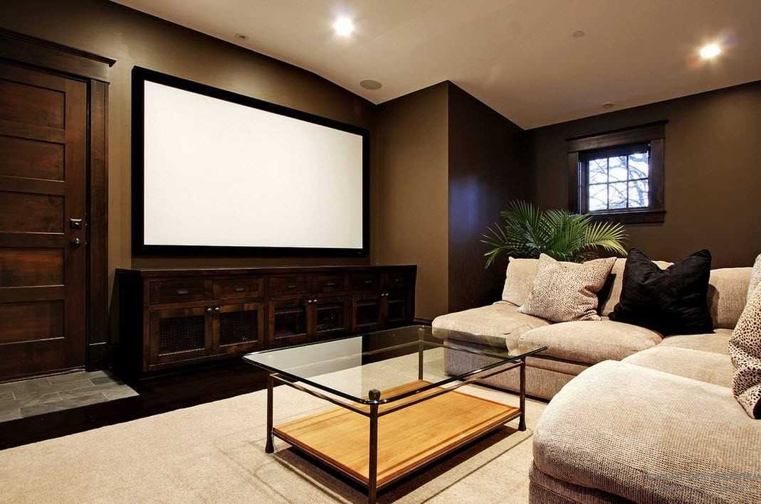 Если коричневому цвету отведена второстепенная роль в колористической схеме интерьера, то разумно его максимально использовать для декора зала: