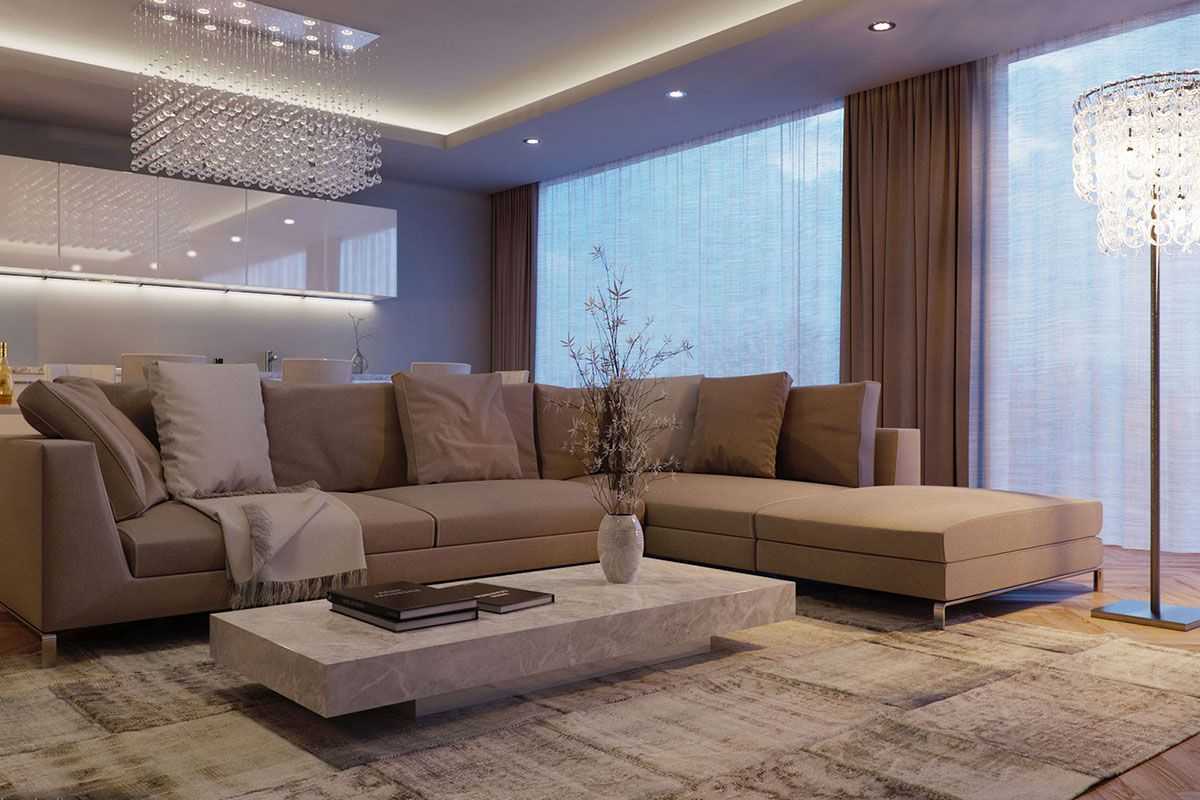Светло-коричневый диван в интерьере гостиной располагает к откровениям и приятному общению с близкими. При смешивании тонов, излучающих свет, с кофейной палитрой создается ощущение легкости и эмоционального комфорта. Подобное комбинирование стоит применить для обустройства комнаты, куда крайне редко попадают солнечные лучи.