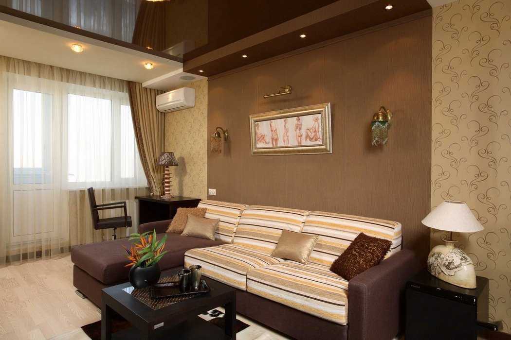 - Какао, кофе с молоком и другие оттенки с добавлением белого можно сочетать со светлой гаммой. Например, присутствие на обоях розовой или персиковой полосы в союзе с коричневым тоном наполнит гостиную романтичностью и чувственностью.