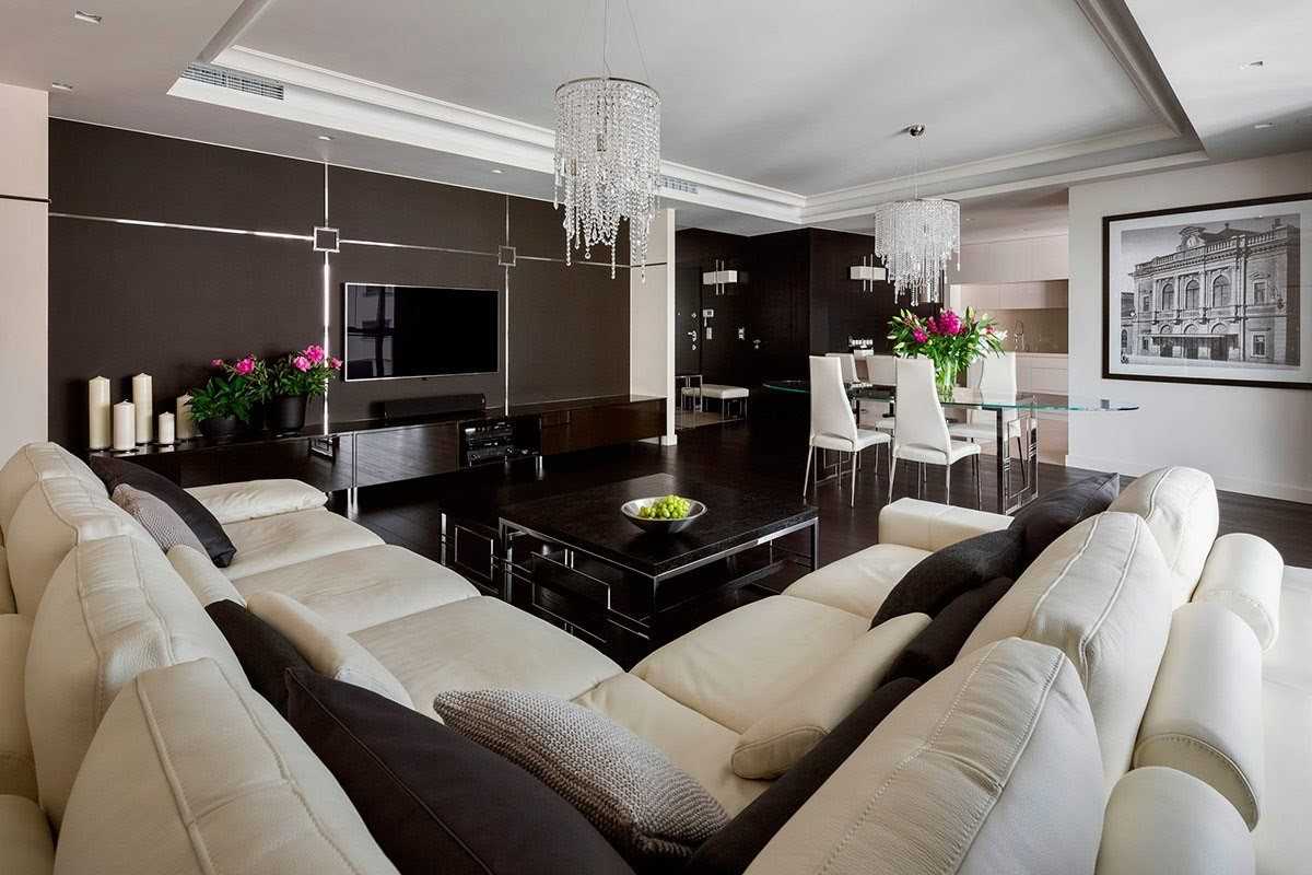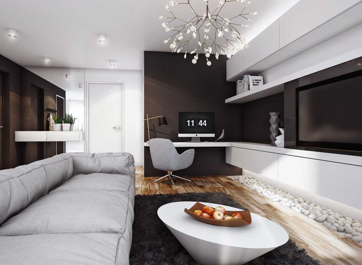 - Комбинация из черного и белого. Универсальные тона подойдут для любых стилей гостиной.
