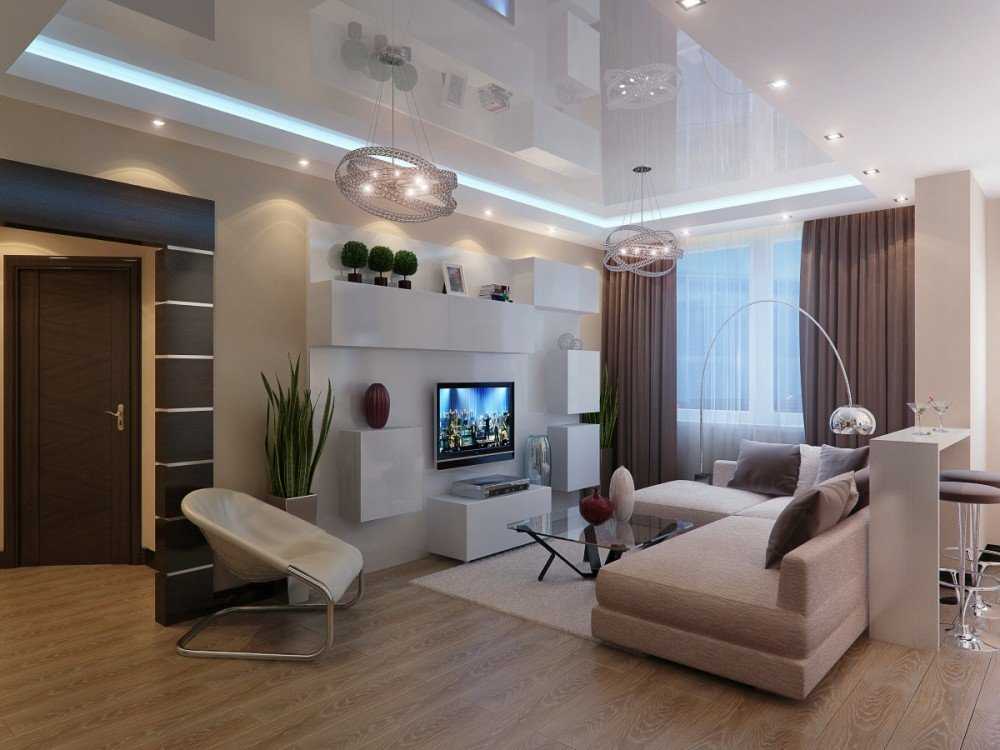 Гостиная, выполненная в современном стиле, позволит задействовать больше красок. Стены могут быть ярких цветов, например бирюзовый, серый, синий или изумрудный.