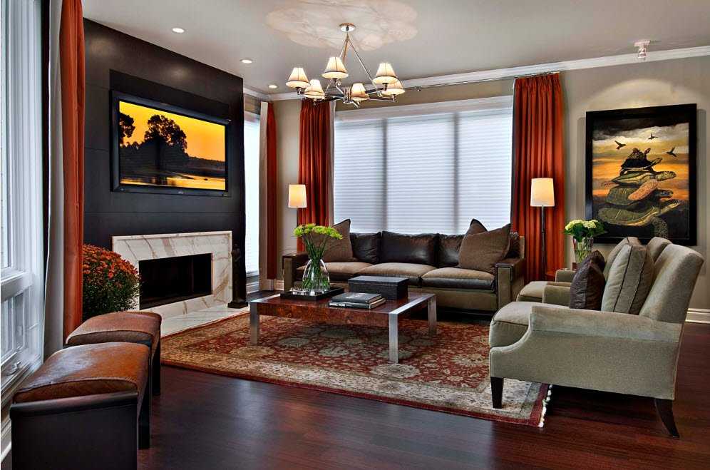 Комната, оформленная в темных тонах, создает ощущение сдержанности и лаконичности. Например, можно выбрать такую композицию: отделка мягкими панелями темного тона, пурпурная мягкая мебель и золотистые светильники. Вариантов оформления гостиных разработано очень много. Гармонично дополняют интерьеры кожа, камень, древесина, особенно актуально применение таких пород, как дуб и вишня; особую популярность заслужил и ясень шимо. После завершения основных работ по оформлению, приходит время аксессуаров. Без этих акцентов картина не будет полной.