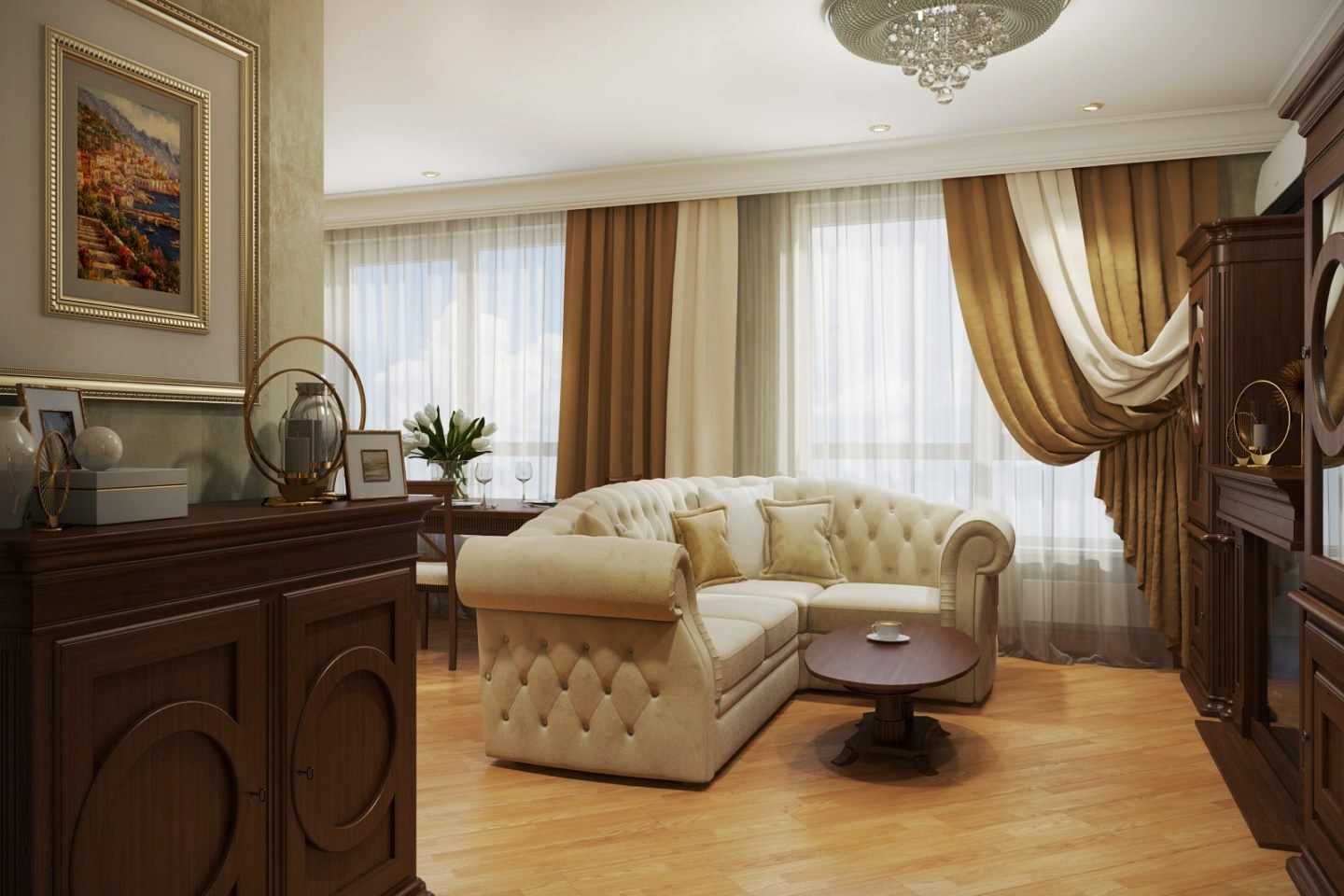 Оформление окон в бежевых гостиных нужно выполнять натуральными тканями. Рекомендуется отдавать предпочтение шелку и льну. В портьерах могут сочетаться самые различные цвета. Например, хорошим вариантом считается желтая или абрикосовая занавеска, дополненная узором изумрудного, небесного или оранжевого оттенка. Прекрасно смотрятся и бежевые занавески, украшенные золотым орнаментом.