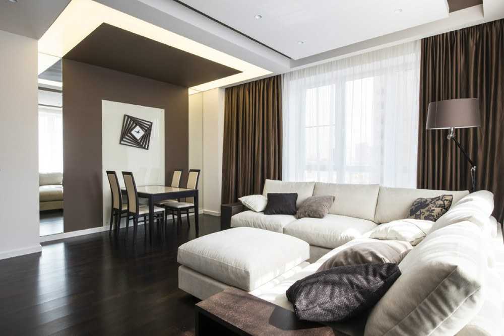 Белый придаст интерьеру зала элитарный вид, подчеркнет упорядоченность и теплоту, исходящую от смеси кофе с молоком. Классическую манеру оформления получится создать при использовании объемных гостиных гарнитуров из моренного дуба, выбелки архитектурных изысков интерьера – колон, потолочных сводов, лепных карнизов. Современную эстетику легко выделить при помощи лаконичной белоснежной меблировки зоны отдыха, оформления окон римскими шторами бурого цвета. Выигрышно смотрится двухслойная фактурная покраска стен, где сквозь белесые узоры просвечивается темно-коричневый фон.