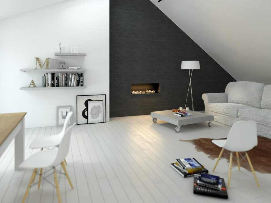 Главной изюминкой в оформлении минималистической гостиной становится камин на всю стену. Комната смотрится более привлекательнойИсточник roomester.ru