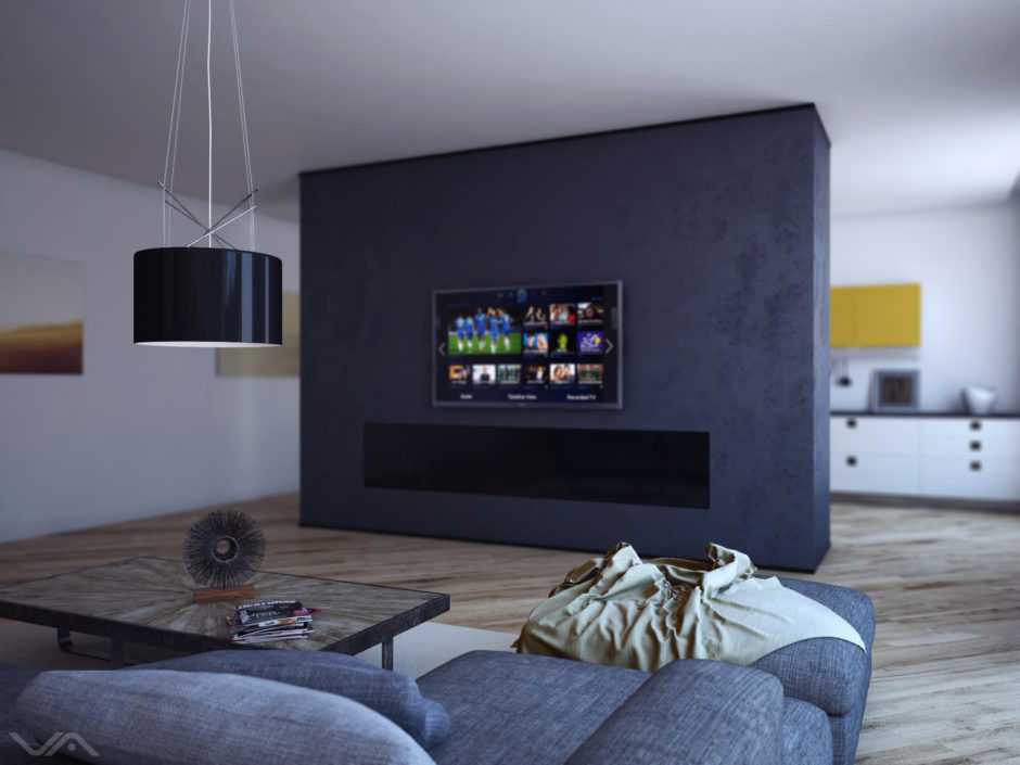 - невысокая мебель – барная стойка, обеденный стол, диван, постамент с плазмой;