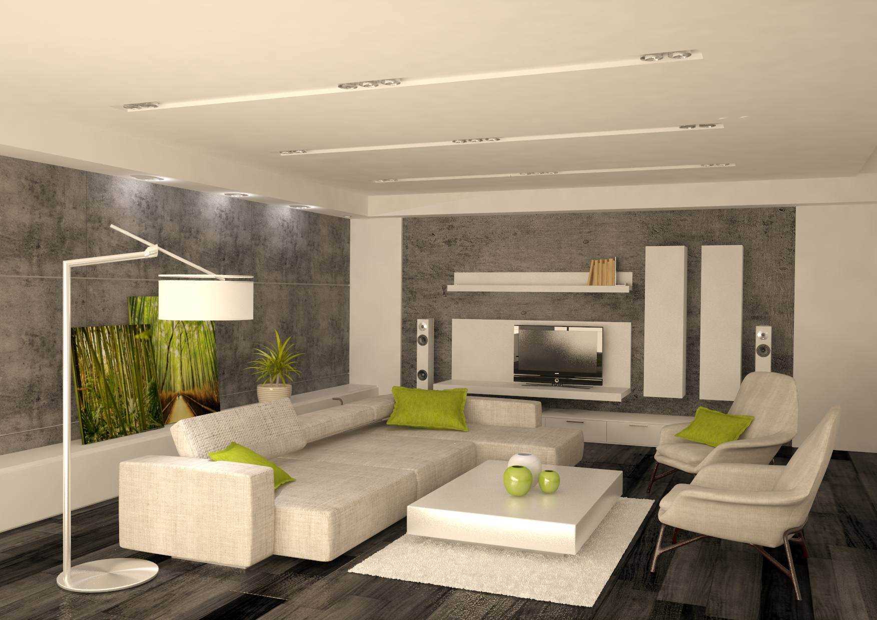 Независимо от того, в каком стиле предполагается оформить зал, его отделку нужно вести сверху вниз. Потолок станет первой поверхностью, которая будет приведена в порядок. Она может остаться классически белого цвета или дополниться неброским сдержанным рисунком. Допускается в минимализме сооружение конструкций подвесного и натяжного типа. Поверхность потолка может быть как одноуровневой, так и многоярусной, с замаскированной системой подсветки, однако без перегибов в сложности обустройства. Только четкие линии и ровные углы.