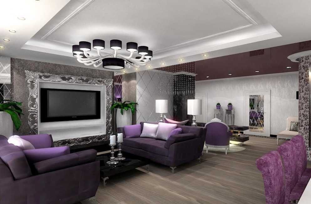 В помещении с минимальным количеством предметов, оформленном в спокойных тонах, эта часть интерьера может стать главным акцентом. С такой функцией справятся натяжные потолки. Оттенки, декор полотен выбирается с учетом общей обстановки. Если в гостиной проводится зонирование, многоуровневые конструкции окажут существенную помощь.