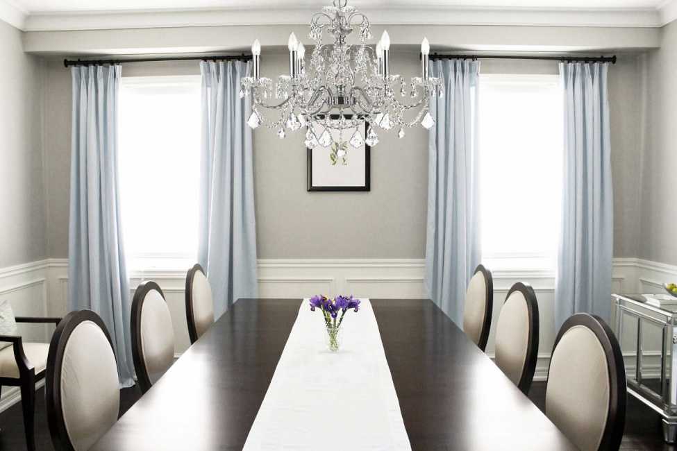 Для люстры в обеденной зоне расстояние между нижней точкой и столешницей должно составлять не менее 80 см. Следует также учитывать и размер стола: если он маленький — лучше взять люстру минимально допустимого размера. Чем больше стол, тем крупнее может быть подвес. То же касается и спальни: чем шире кровать — тем массивнее люстра.