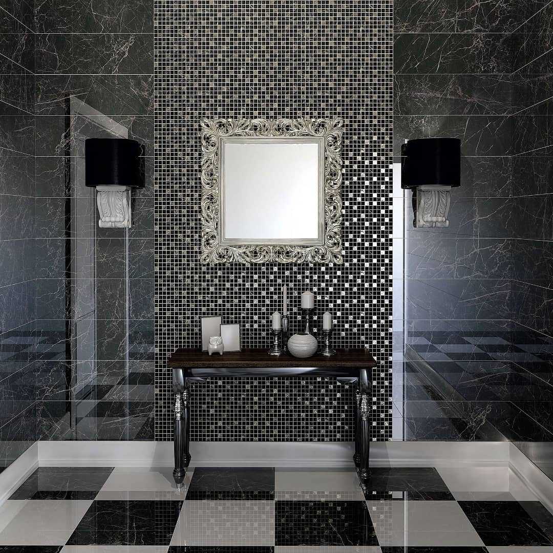 - Чёрную плитку допустимо выбирать разнообразной текстуры – матовой для пола, а для стен – глянцевой или зеркальной. Облицовка необязательно должна быть чисто чёрной – пусть она имеет синий, красный или зелёный отлив.