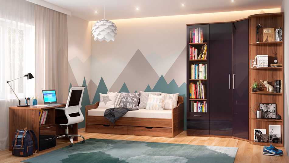 Как обустроить угловую комнату с двумя окнами? Если вы решили занавесить проёмы шторами, то лучше не выставлять здесь тяжелую мебель. Достаточно будет легкого кресла, если стекла панорамные — двухместного дивана или декоративных деталей.