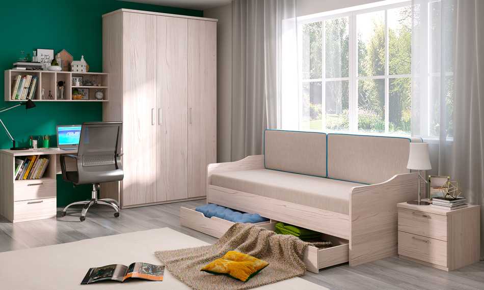 Для видимости ансамбля рисунок текстиля повторяют в отделке мебели, располагая ее вокруг эркера под окнами. Это могут быть модули дивана или тумбы-сидения с выкатными ящиками.
