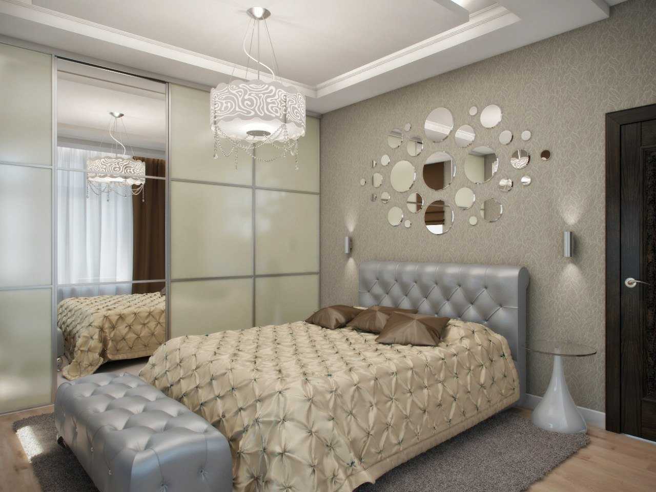Маленькое жилое помещение независимо от назначения нуждается в визуальной коррекции пространства. Решить проблему в случае со спальной комнатой маленькой площади помогут зеркальные поверхности: декоративные настенные панно, натяжной глянцевый потолок, блестящие фасады шкафов и поверхность полочек.