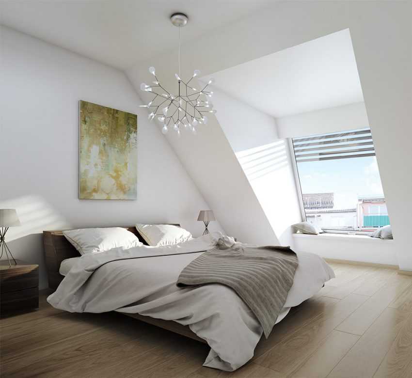 Чердачный стиль в спальне используют редко. Но если вы решитесь на такой эксперимент, то сочетайте в комнате элементы бытового и промышленного назначения. Это могут быть кованые трубы, нешлифованные доски, металлические конструкции, кирпич. Кровать в комнате в стиле модерн должна быть исключительно строгой формы. Постельное белье для такой спальни лучше сделать тёмным.