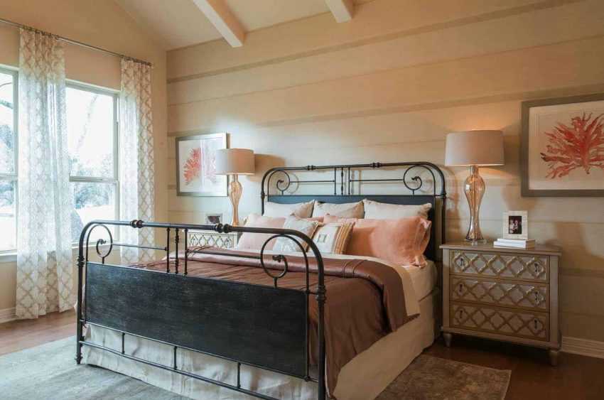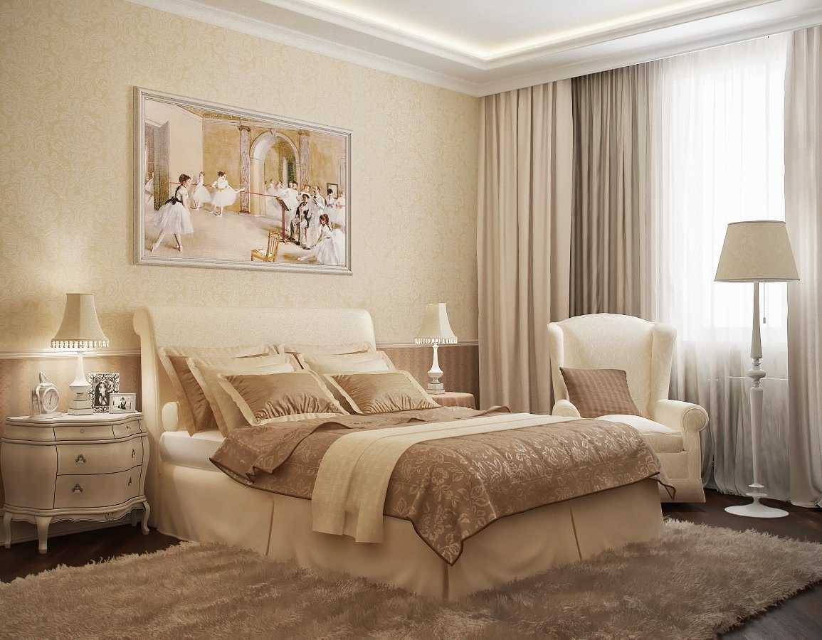 Рассмотрим несколько наиболее популярных композиций песочного цвета в интерьере опочивальни: