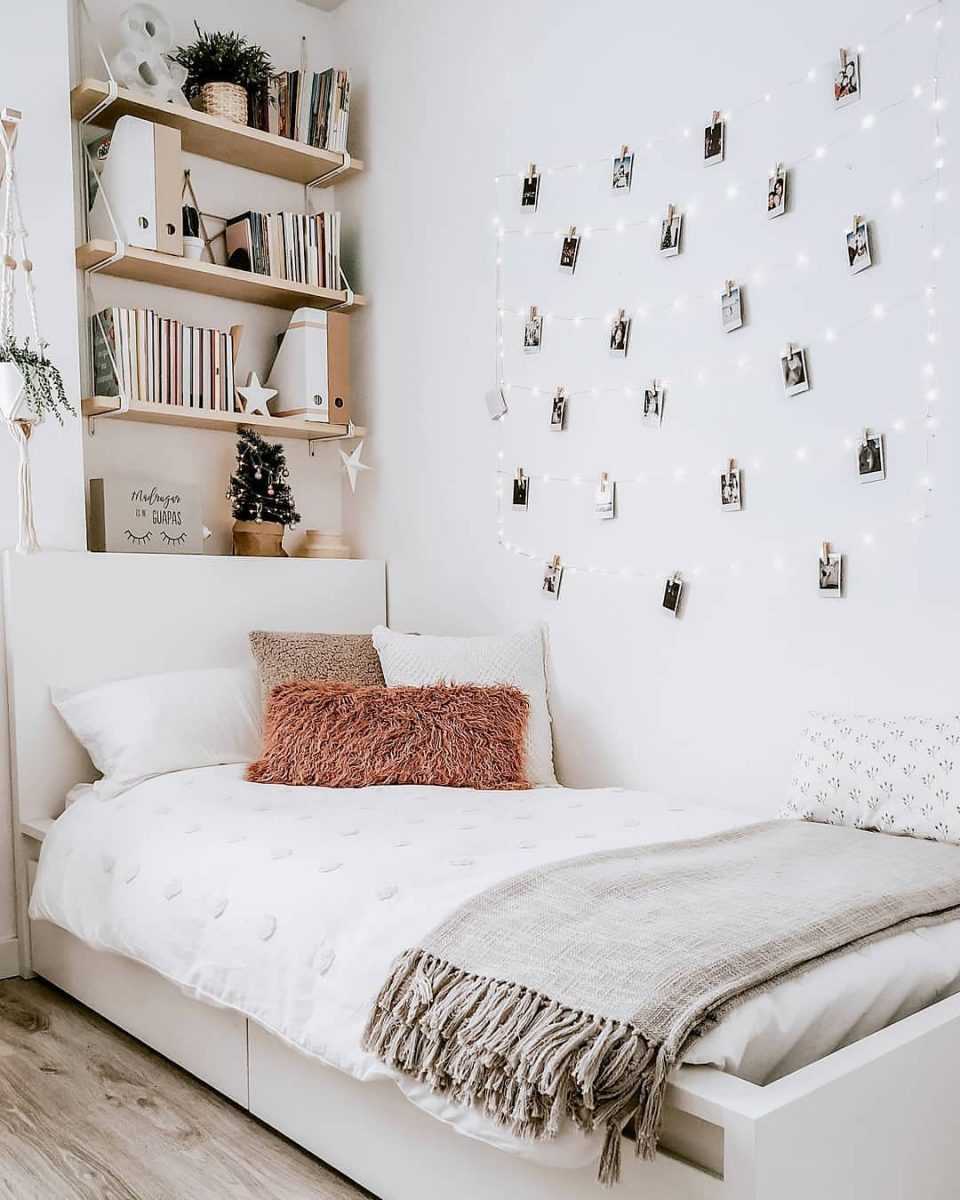 Скандинавский стиль – это максимальная светлая простота. Нет громоздким предметам мебели. В такой комнате должно быть максимум света. В качестве текстиля берите вязаные, грубые, натуральные фактуры. Тумбы и шкафы замените открытыми полочками. Для оформления пола лучше подобрать древесину. Красиво смотрятся вязаные пледы и подушки на кровати и в кресле.