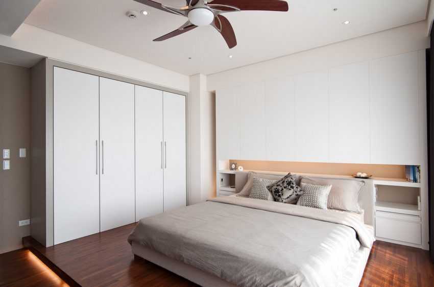 Шкафы и тумбочки тоже должны подчиняться этому правилу. Кроме того, от них требуется полное отсутствие декора, открытых ниш и полочек. Идеальный вариант — шкаф-купе.