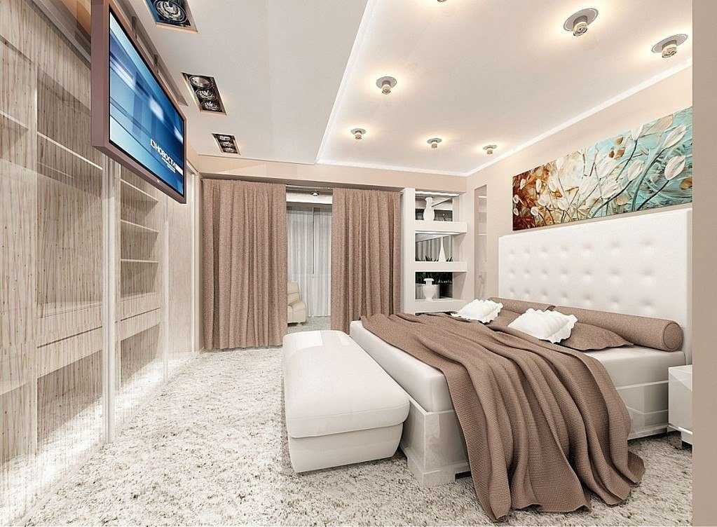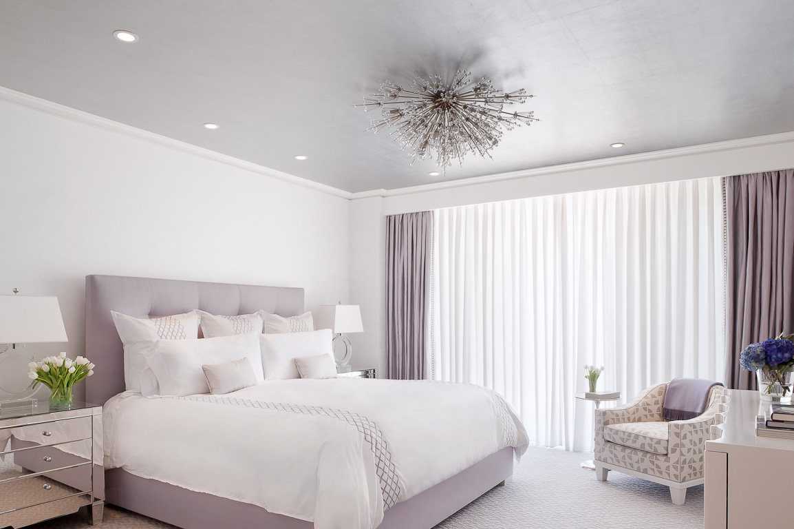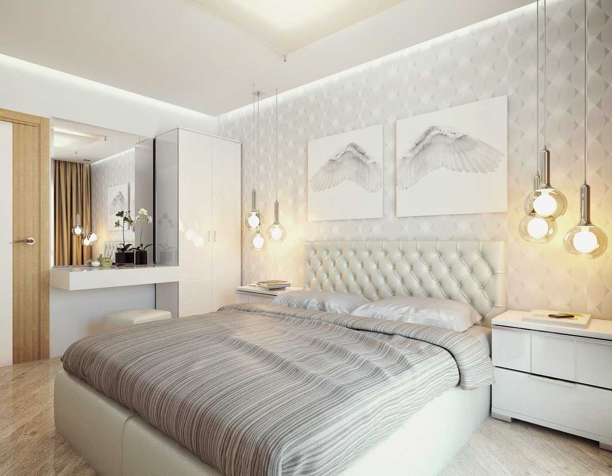 Современный дизайн спальни в светлых тонах сильно выиграет, если использовать скрытые источники освещения вместо бра, торшеров и люстр. Это может быть точечная подсветка в потолке или светодиодные ленты.