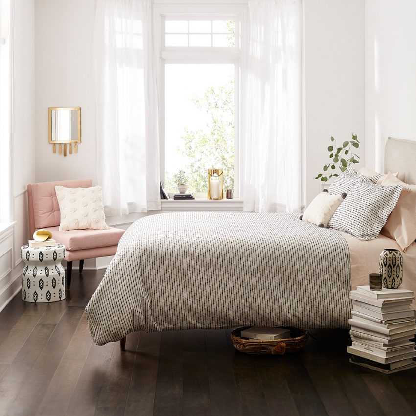 К текстилю требования те же, что и ко всем материалам в интерьере: можно играть разными фактурами, придерживаясь спокойной гаммы. Постельные принадлежности должны быть однотонными, но вполне могут отличаться по цвету.