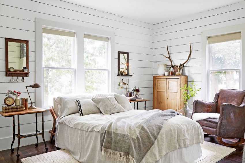 Для стиля кантри желательно использовать побелку на стенах. Мебель максимально простая. Допускаются как компактные формы, так и громоздкие. Люстра – обязательно из дорогих. При оформлении светлой спальни в стиле кантри используйте ткани с рисунком. Особенно актуальны клетка и полоска. Кроме светильника старайтесь избегать показной роскоши в комнате.