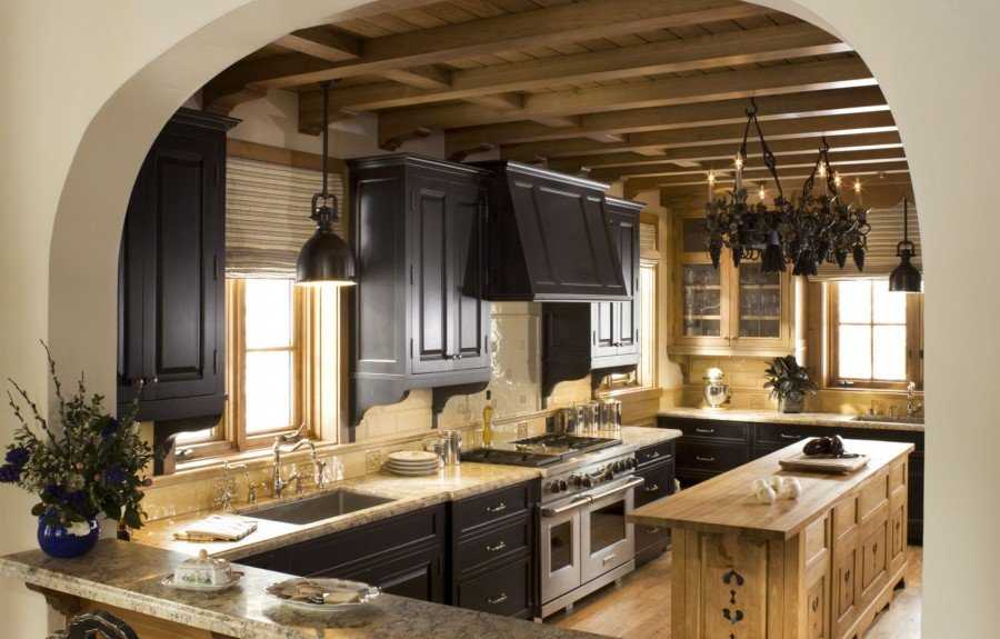 Мебель в такой кухне лучше смотрится комбинированная. Например, деревянные стулья с коваными ножками будут выглядеть лучше лаконичных аналогов без отделки. Можно установить в кухне фальшкамин, украсив его камнем или имитацией кирпича. Для потолка можно выбрать гипсокартон. Весит этот материал немного, поэтому не создаст нагрузку на несущие стены. При этом оформление будет необычным и позволит при желании скрыть внутри системы коммуникации.