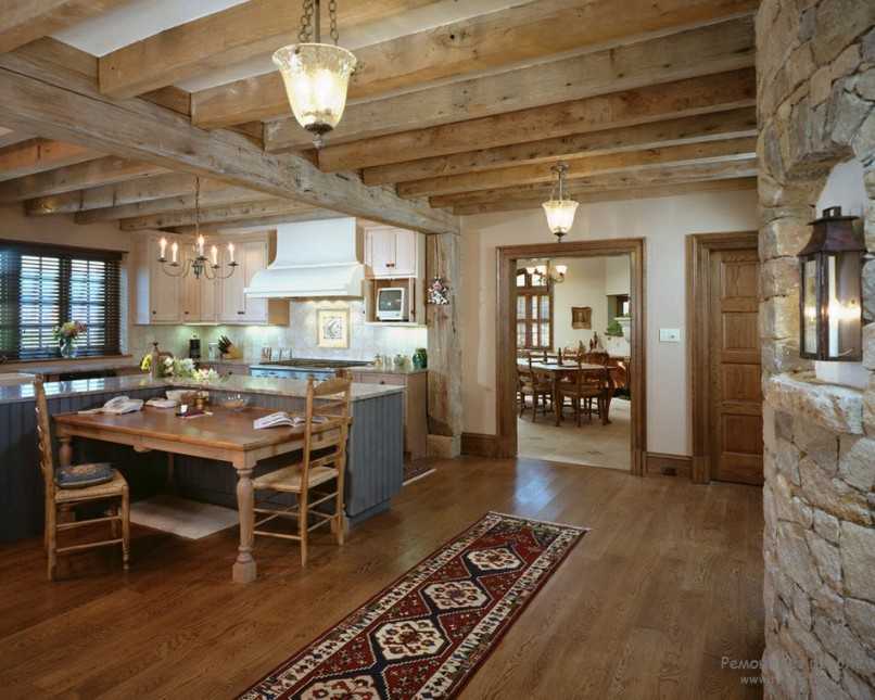 Потолки чаще всего украшаются балками всевозможных оттенков, полы отделывают ламинатом, настилают паркет или доски, прекрасно гармонирующие с деревянными стенами.