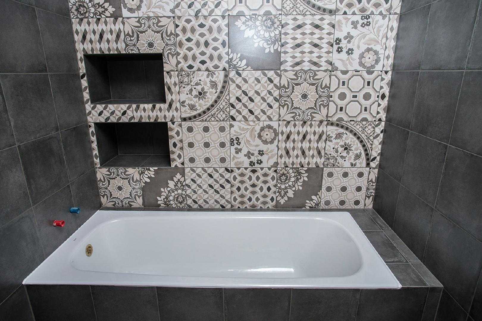 Самые модные в 2019 году дизайны плитки — бетон и дерево. Первые выглядят очень круто в матовом исполнении(но матовая и стоит дороже), а дерево при глубокой текстуре. Т.к. бетон серый и неоднородный, даже при отсутствии текстуры он очень практичен и на нем не видны пятна от воды. Посмотрим варианты серой облицовки на реальных фото.