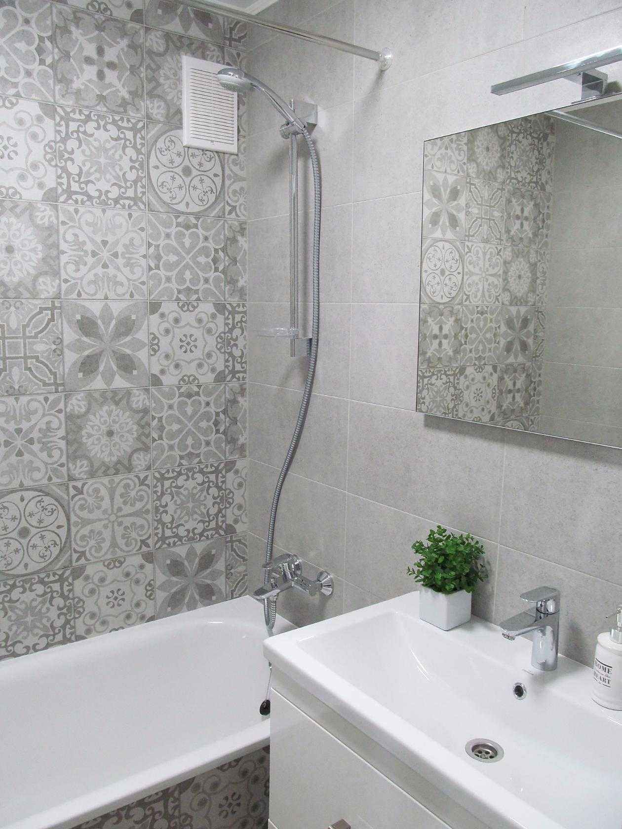 В основе дизайна — серая плитка на стенах с диагональным тиснением. Расстановка их по своей задумке дала еще более интересный эффект.