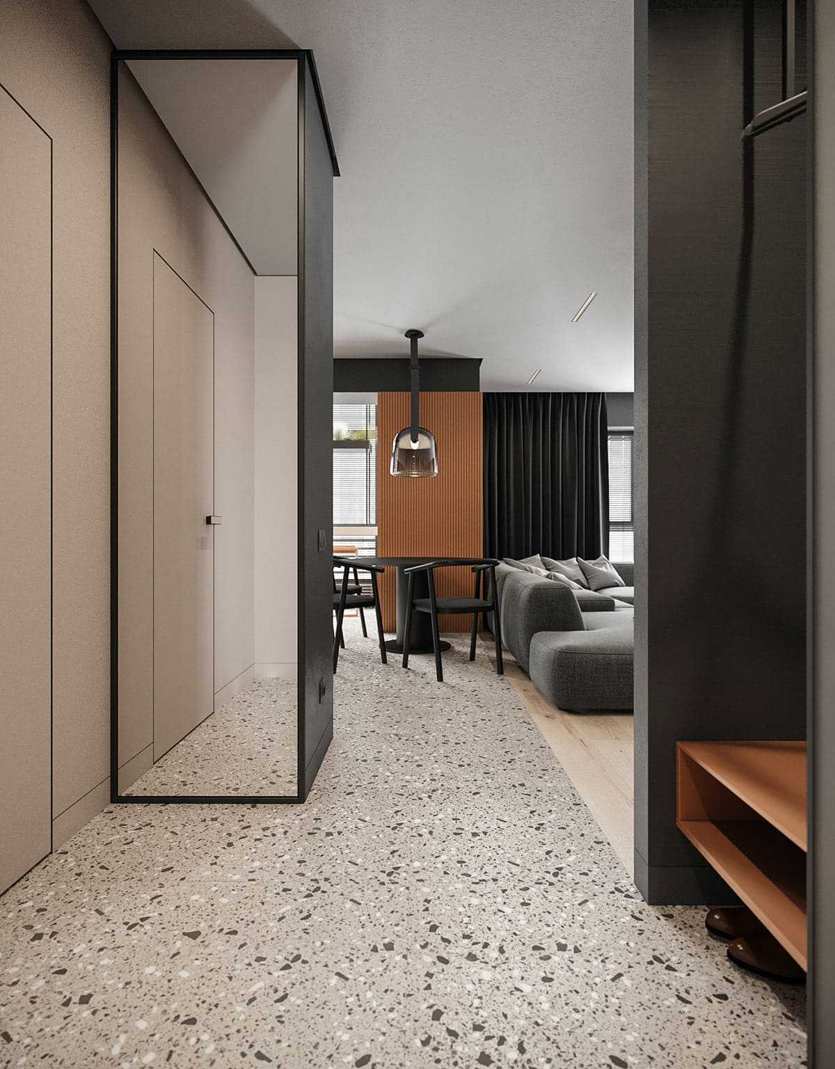 Если при отделке квартиры осуществляется приём зонирования пространства, то можно смело использовать серую основу (нескольких оттенков) и одновременно тёплые и холодные тона. Например, пепельно-серый вместе с оранжевым и фиолетовым будет хорош с небольшим добавлением белого, который слегка разбавит модный контраст.