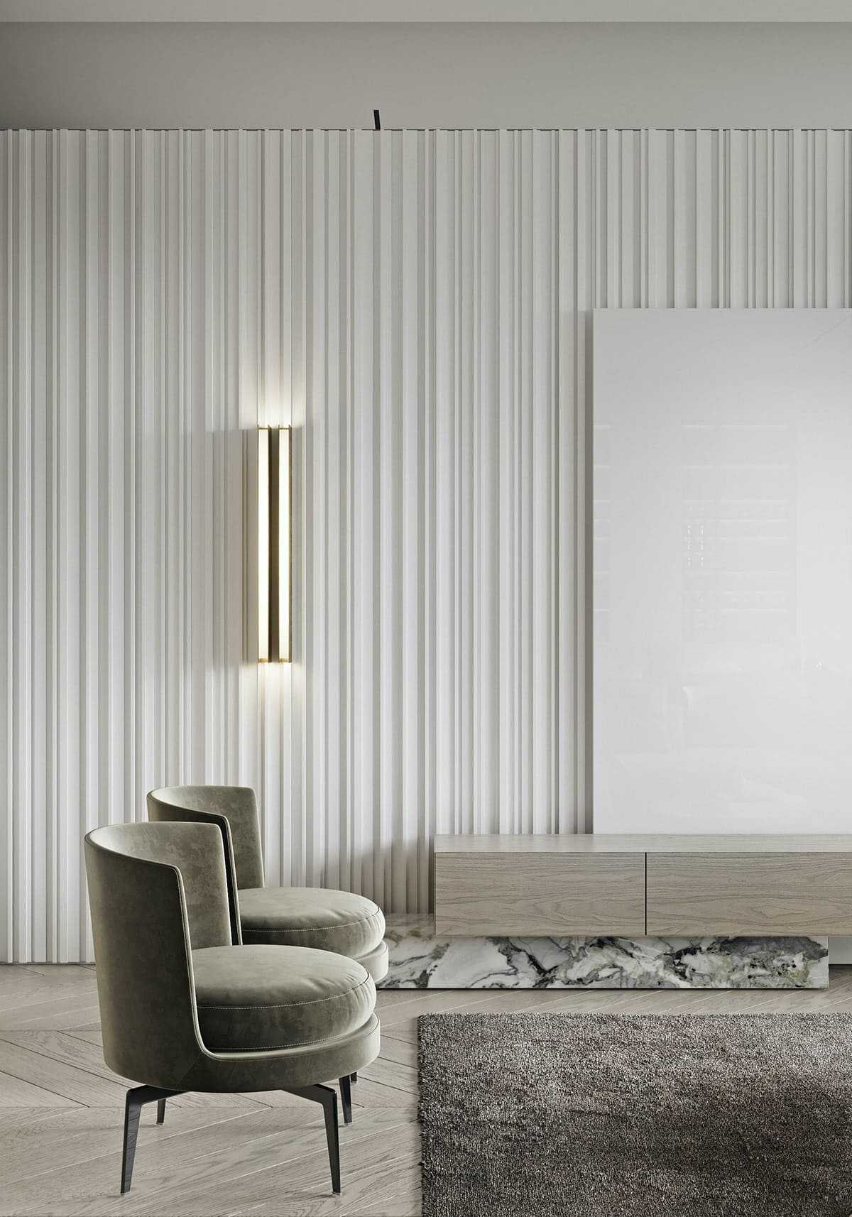 В большинстве случаев платиновую палитру заменяют белые обои в интерьере гостиной, которые содержат ненавязчивый серебристый или стальной узор. Они не бросаются в глаза, не загромождают пространство, являясь ненавязчивым декором и формирующей настроение отделкой.