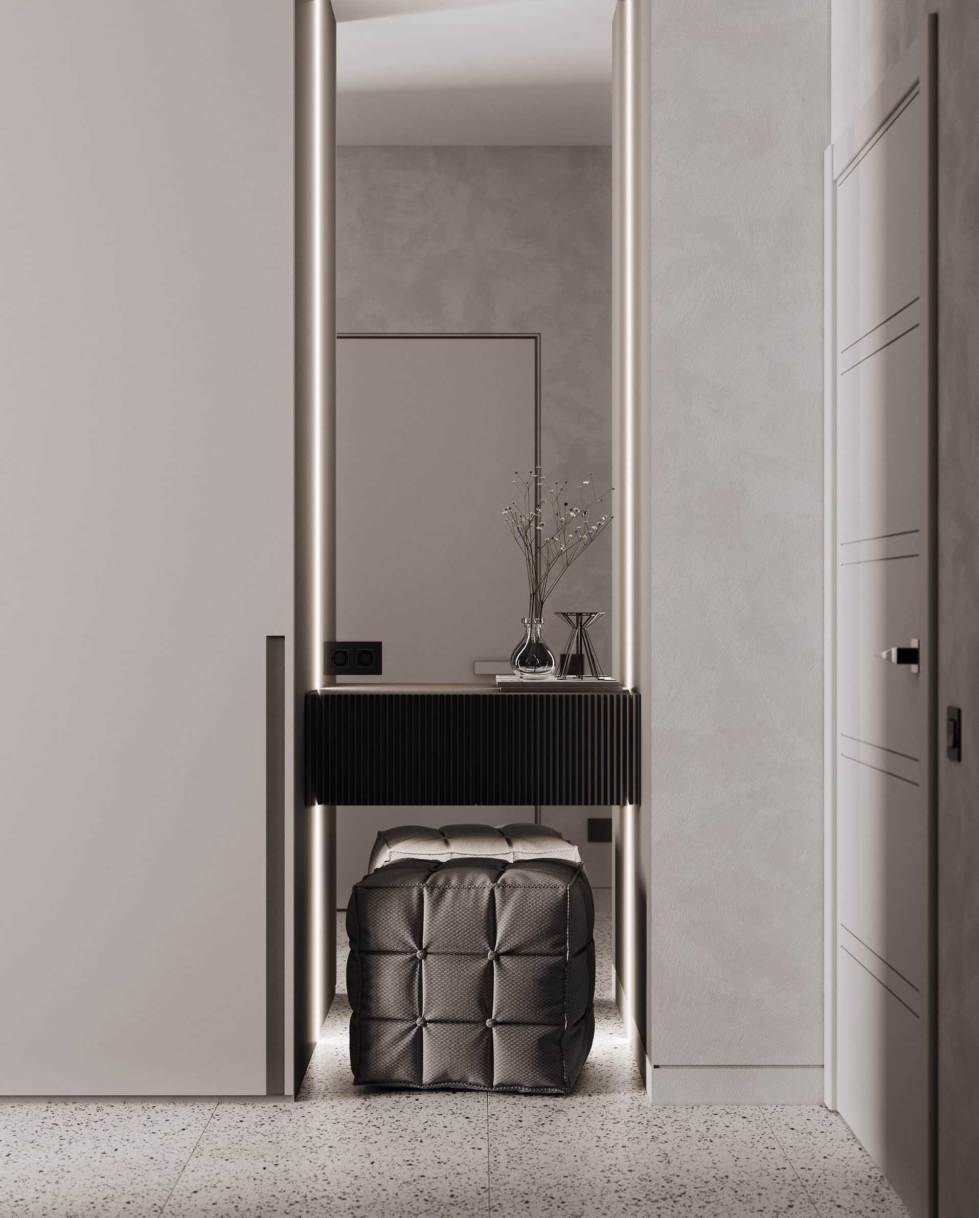 На фото серо-бело-бежевый интерьер малогабаритной гостевой комнаты.